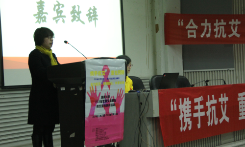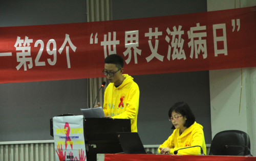 志愿者代表发起防艾倡议,倡议师生关注艾滋,认识艾滋、抵御艾滋,要行动起来,奉献爱心,消除歧视。