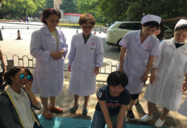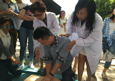 “徒手心肺复苏操作术”看似简单,实际操作起来需要耗费很大的体力,我们的护士跪在地上大家反复的操作演练,一个下午下来手和膝盖都发红了,但是看到大家高涨的学习热情她们一点也不觉得累,只是觉得很欣慰。陆续也有路人过来测量血压和咨询相关疾病预防与保健知识,我们的医务人员都热情耐心地为他们讲解,不知不觉日已西斜,广场的行人渐渐的散开,我们的活动也结束了,走在回医院的路上大家脸上都带着浅浅的笑意,一路默默不语,不是因为疲劳而是因为从心底里涌出的自豪与感动。