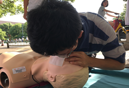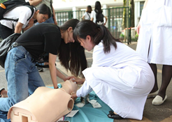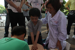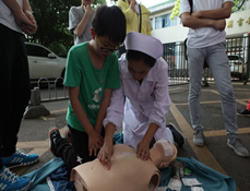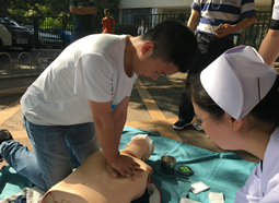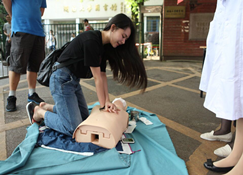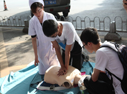 许多的游客、学生和退休了的大爷大妈们也都参与到了我们的义务培训当中,其中一位七十多岁的大爷给我们留下了深刻的印象,他开始的时候默默的站在旁边认真的听讲,脸上带着微笑,我们多次邀请他来在模型上操作他都拒绝了,后来他说:“我还是试试吧,虽然我七十多岁了,不过哪天要是在街上碰到了倒在地上的人,或是我的街坊领居们哪天突然发生状况了我兴许也能帮上点忙。”后来他就跪在了硬硬的水泥地上开始了操作,操作完后他感慨道:“这还是蛮费力气的,你们医生护士平时救死扶伤真的了不起!”