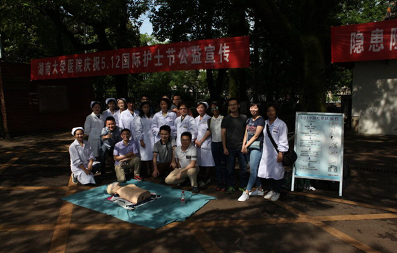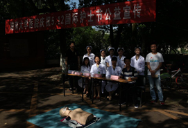 阳光从树叶的缝隙间洒落在白衣天使的身上,散发着仁爱的光芒,她们在树荫下忙碌的身影吸引了路人的驻足,利用休息时间来岳麓山举行活动的东航乘务队的空姐空少们也来到了我们的活动现场,在上岗前他们都需要通过“徒手心肺复苏操作术”的培训,并在工作中有过多次对乘客实施紧急救助的经验,他们说:“你们的活动开展得太有意义了,如果能让更多的人了解并掌握正确的徒手心肺复苏操作,那么我们在飞行途中遭遇紧急情况时也能有更多的帮手。”在对心肺复苏模型进行了操作练习后他们与我们愉快的合影。