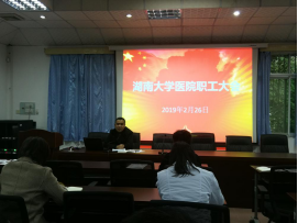 在会上,总支书记张坤传达了2019年学校寒假务虚会精神,介绍了学校2019年度工作要点情况及给医院下达的任务和要求,并对医院2019年重点工作进行部署。张坤书记指出,2018年医院取得了可喜的成绩,获得了学校二级单位年度考核优秀单位、学校宣传思想工作先进单位、岳麓区疾病预防控制工作先进单位、岳麓区艾滋病防治宣传教育先进单位、岳麓区驻街单位卫生和计划生育工作考核评估第一名等荣誉,是全院职工齐心协力、共同努力的结果,医院要以此为契机,在新的一年认真贯彻学校第九次党代会精神,将按照学校“两个全面”和“两个全力”的总体要求,把好医疗质量关,重点解决医院内部机构管理、基础建设、队伍建设、绩效与薪酬等方面的问题,着力提高医院健康管理能力和医疗服务水平,为广大师生提供更好的医疗健康服务。