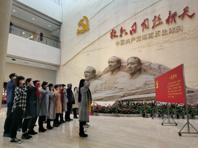在湖南省党史陈列馆,全体党员在名为“潇湘魂”的伟人雕像前重温入党誓词,庄严宣誓。随后,大家边参观并认真聆听讲解员讲述了“开辟新天地”、“描绘新画卷”、“谱写新篇章”、“三湘群英会”等主题党史故事,重温了我们党在新民主主义革命、全面建设社会主义、改革开放等三个历史时期三湘儿女的奋斗历程,体会到党在发展过程中所经历的重重障碍,了解了党在各个时期的战略任务和发展脉络。