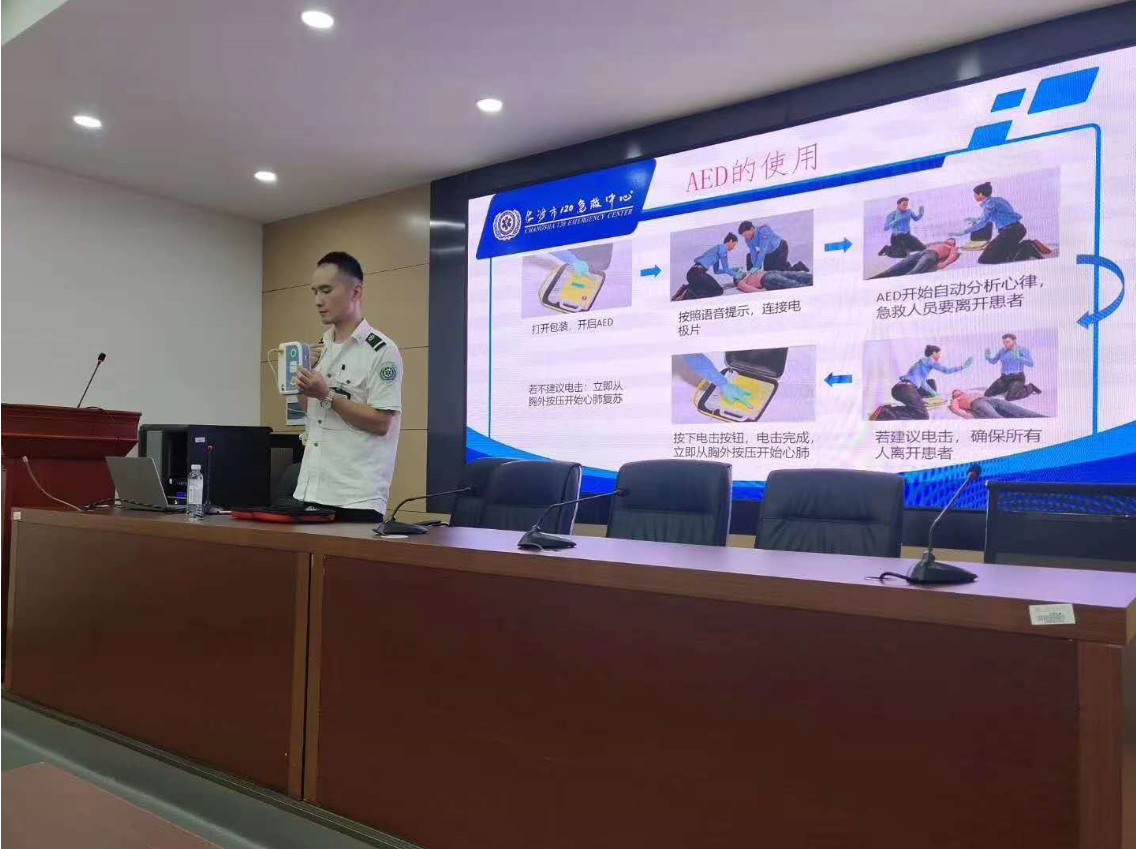 长沙市120急救中心培训科导师带领我们对徒手心肺复苏操作技能、气管插管操作要领、AED(自动体表除颤仪)使用方法进行了系统全面的讲解和演示。