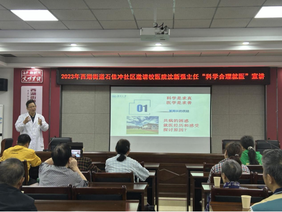 面对目前大医院就医难,老年人看病难等实际问题,9月26日上午,校医院联合财院校区管委会、石佳冲社区举办了一场“科学合理就医”的健康知识讲座,由沈新强主任主讲,旨在引导师生科学合理就医,合理利用医疗资源,减少老年人看病难等问题。活动内容详实,贴合大众所需,参加听课的人员有财院校区在职及离退休教职工。