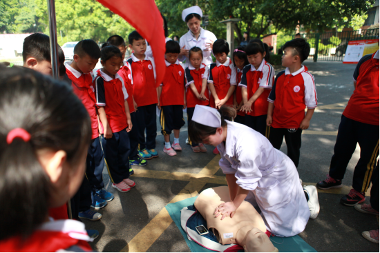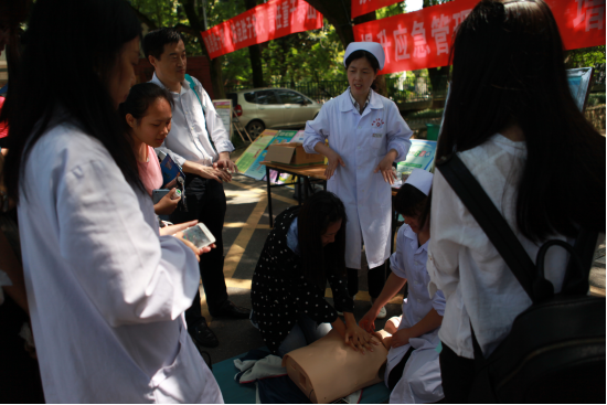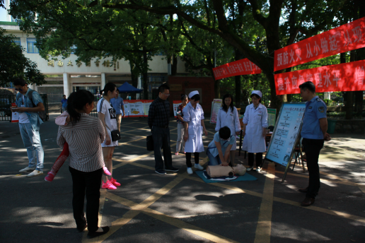 今天是久雨之后的晴天,阳光温暖、空气清新,来游山爬山的人特别多。9:00我们的场地刚刚布置妥当,就有一位带着妈妈和宝宝散步的湖大老师过来了,要求学习“心肺复苏”技术,看她的招式就知道有一定的功底了,但认真的劲儿让我们感到责任重大----一定要教好她!一群小学生在老师的带领下,全文诵读了“防火三字经”后,要求学习“心肺复苏”,孩子们全神贯注看演示,争先恐后做体验,别看他们小小年纪,竟然说出“能够救人生命,再累也要学会”的豪言壮语!本校的学生来了,外校的学子也过来体验了,一位女生的动作很标准,一问原来是护校学生!年轻的小伙来了,漂亮的姑娘来了,妈妈带着孩子来了,白发的老者也过来,看,这位阿姨学得多投入!这位老伯的动作是多么的规范!这位阿姨是外省来游山的,她说今天学习了急救技术,收获真大,谢谢你们!还有一位中年男子说,我一定得学会这项技术,我岳父岳母都有心脏病!当得知我们的一位同事在家用“心肺复苏”挽救了昏厥的婆婆的生命时,这位先生说以后找媳妇一定要找医务工作者!
