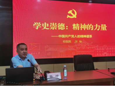 6月24日下午,tapplay,点点体育官方网站登录入口党总支书记张坤以《学史崇德:精神的力量》为题讲党史学习教育专题党课。学校党委党史学习教育领导小组第五指导组组长、纪委监察处处长彭世文到会指导,医院领导班子成员、党总支委员、中层骨干、党员干部、入党积极分子及党外人士代表到会听课,院长彭欣辉主持。